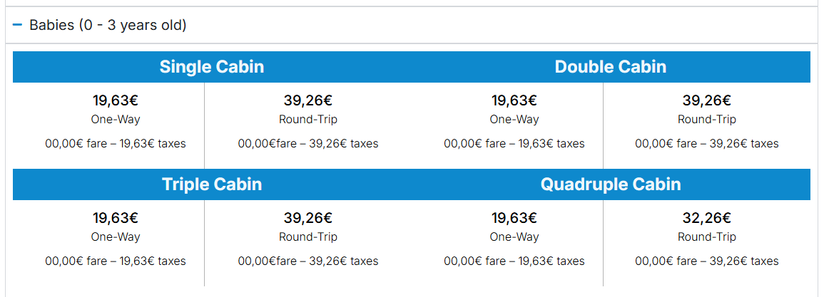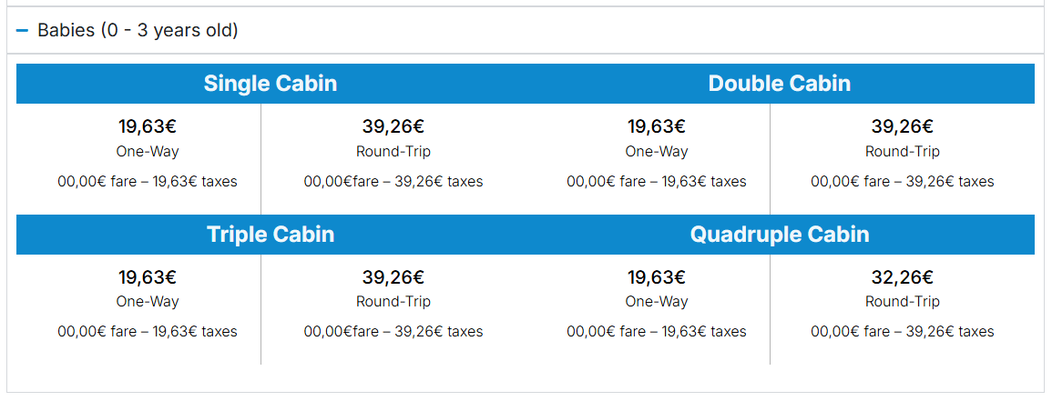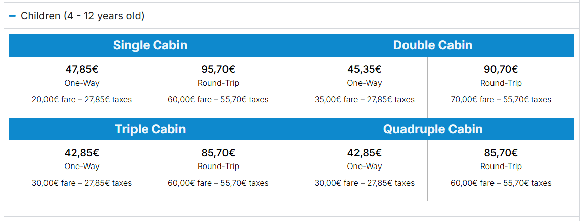 Pricing depends on the class of ticket you purchase. In the tables below, we provide possible price options based on class and passenger category.